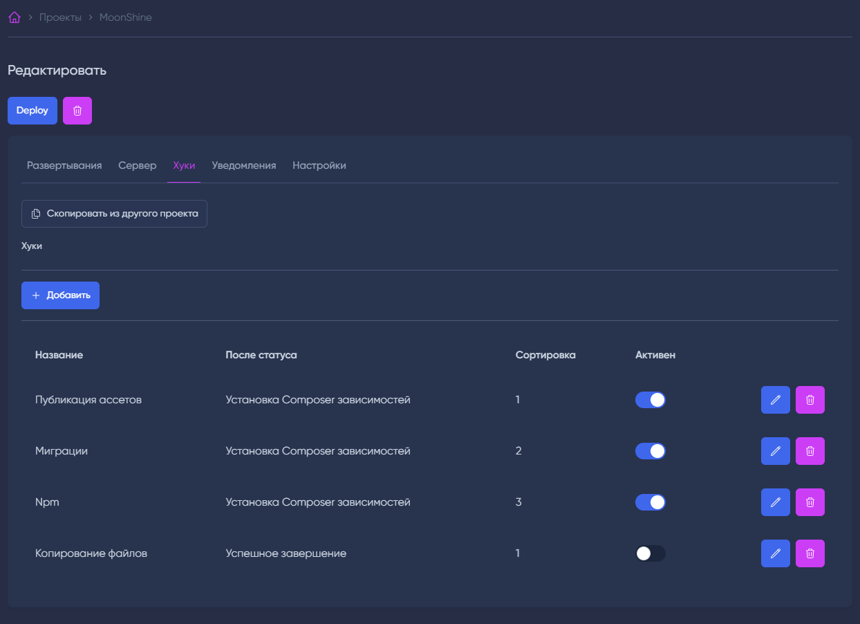 Web-хуки позволяют вам настроить по-своему весь план deploy, написав небольшие сценарии Bash для автоматизации этапов.