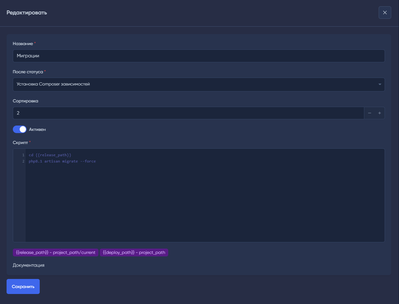 Для этого добавляем новую команду. Назовём “Выполнение миграций”, выполняем после этапа “Установка Composer-зависимостей”, приоритет оставляем “0”, в поле команды пишем “php artisan migrate” и нажимаем “Создать”.